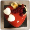 Lesklý vzhled na povrchu dodává červená zrcadlová čokoládová glazura.