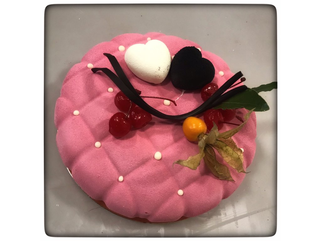 Základem dortu je vyšlehaná živočišná smetana společně s mascarpone. Krém je prokládám třemi vrstvami tmavého piškotového třeného korpusu. Střed dortu je vyplněn ovocným vkladem z ovocného višňového gelu (70% ovoce). Každé patro dortu je protíráno krémem z višní a zasypáno šupiny tmavé čokolády. Sametový vzhled na povrchu dodává kombinace růžového kakaového másla. Dort je dekorován koktejlovými třešněmi, čokoládovými spirálami a tečkami z bílé čokolády.